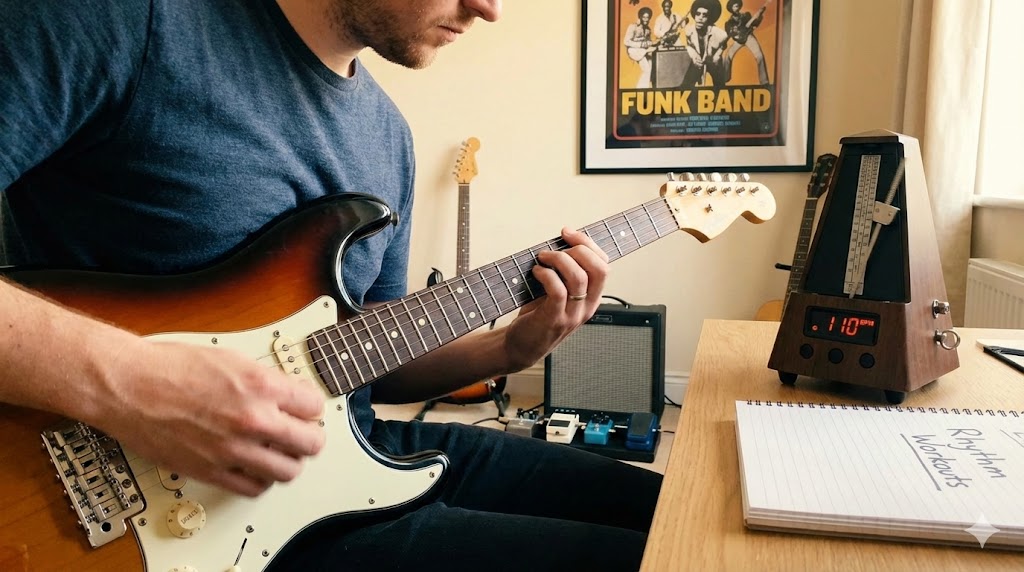 This guide breaks down seven focused rhythm workouts designed for players who’ve moved past open-chord strumming and are ready to dig in to the techniques that separate gigging musicians from bedroom players. Grab your guitar, set up your metronome, and let’s get to work.